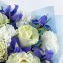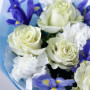Букет из белых гвоздик, синих ирисов и белых роз в Белорецке
