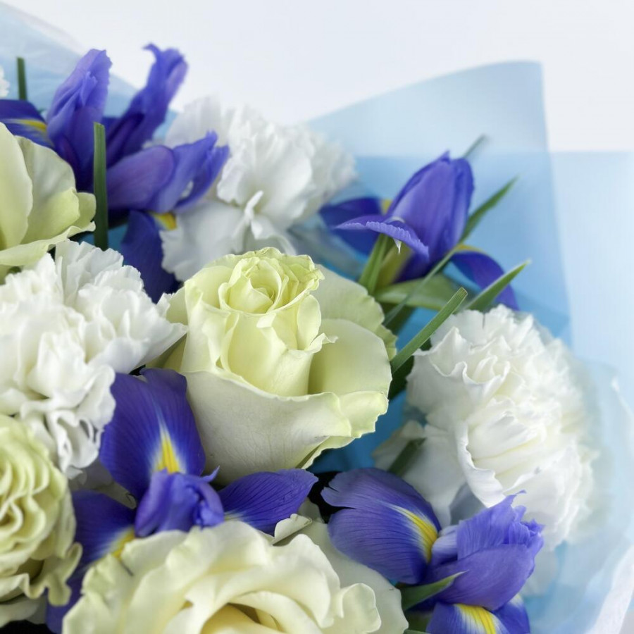 На фото букет из белых гвоздик, синих ирисов и белых роз. В составе: ирис 5 шт, роза 5 шт, гвоздика 6 шт, дизайнерская упаковка 1 шт, атласная лента 1 шт, . Все цветы свежие и ароматные, букет красиво оформлен и отлично подходит для подарка. Доступна доставка цветов или самовывоз.