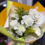 На фото букет из калл и гвоздики. В составе: калла 2 шт, гвоздика 5 шт, писташ 3 шт, крафт-бумага 1 шт, атласная лента 1 шт, . Все цветы свежие и ароматные, букет красиво оформлен и отлично подходит для подарка. Доступна доставка цветов или самовывоз.